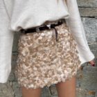 Maak een statement met deze absolute eyecatcher! Deze prachtige mini-rok bestaat uit t grote, glanzende pailletten in verschillende tinten beige en crème. Door de unieke “schubben-structuur” van de pailletten ontstaat er een speels en dynamisch effect bij elke stap die je zet.